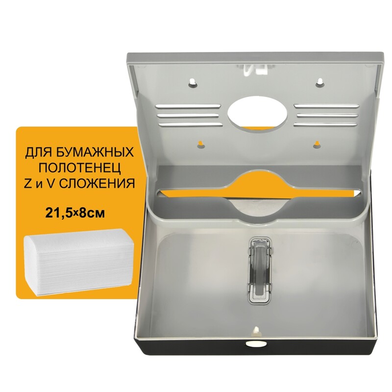 Особенности: из ударопрочного пластика. Подходит для полотенец и V и Z сложения. Загрузка до 250 шт., размер листа в сложенном виде 22х8 см.