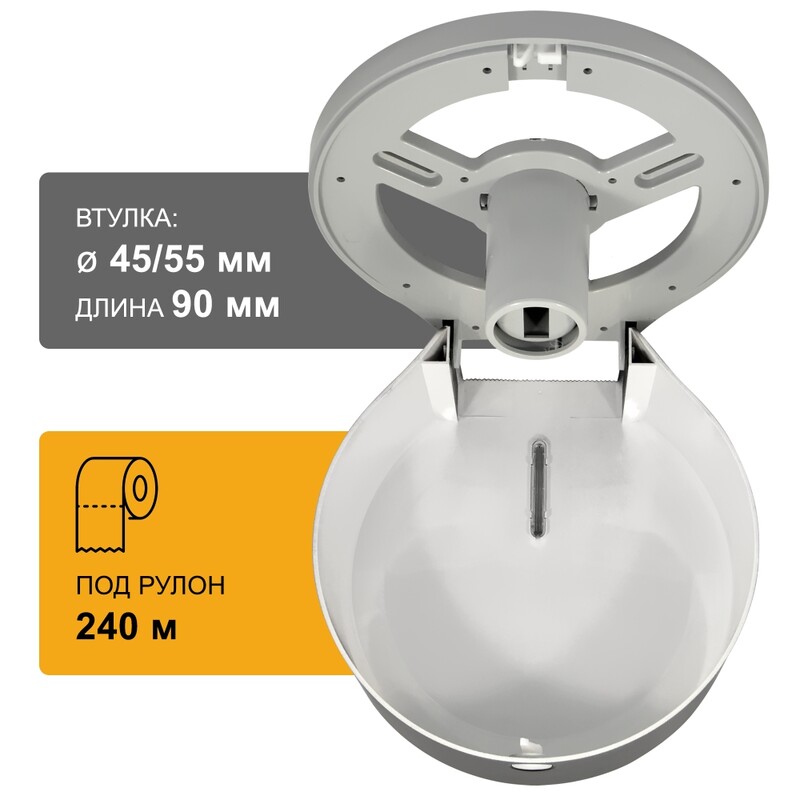 Особенности: под туалетную бумагу диаметром 22 см., с втулкой 45 или 55 мм. Выполнен в глянцевом белом цвете. Закрывается на ключ.