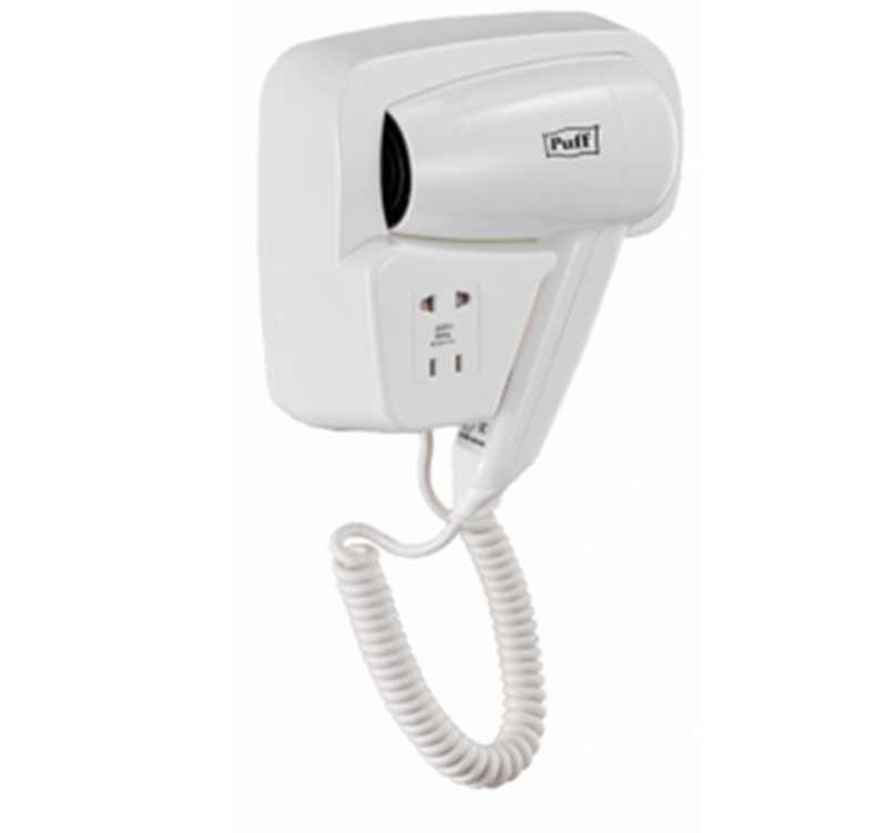 Фен для волос Puff-1200B настенный 1,2кВт белый, с доп. розеткой, 2 скорости