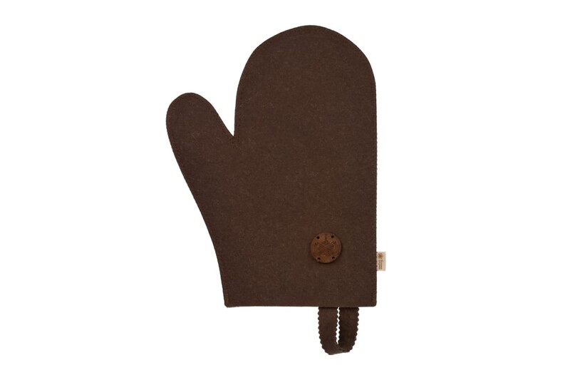 Рукавица с деревянным логотипом Банные Штучки войлок 100%, коричневый 41421 обеспечивает защиту рук от ожогов.