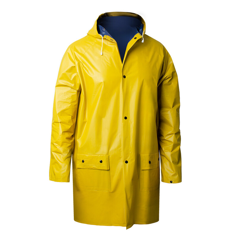 Высококачественный плащ - дождевик из ПВХ (PVC) с карманами. Толщина дождевика составляет 150 мкм. Подходит для многоразового использования. Материал плотный и хорошо тянется, внешне похож на тонкую резину. Состоит из двух слоев: верх выполнен в желтом цвете, а подкладка в синем. Идеальное решениедля городских прогулок.