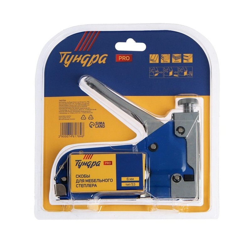 Линейка инструментов ТУНДРА PRO является продуктом нашей собственной разработки.Мы учли все современные требования к качеству и проработали индивидуальную упаковку. Нам важно, чтобы она была в едином стиле и максимально удобна для розничной продажи.Ассортимент товара был подобран на основе длительного анализа потребностей наших покупателей.Степлер мебельный от марки «ТУНДРА PRO» применяется для отделочных работ.Степлер подходит для работ с такими материалами, как ткань, дерево, фанера и ДСП.Тип скоб 53, размер от 4 до 14 мм.В комплекте со степлером идут скобы 6 мм тип 53.