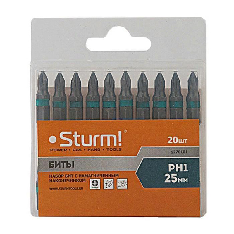 1270101 Биты PH1х25мм, сталь S2, С МАГНИТН. НАКОНЕЧНИКОМ,20 шт. в пластик.кейсе Sturm!