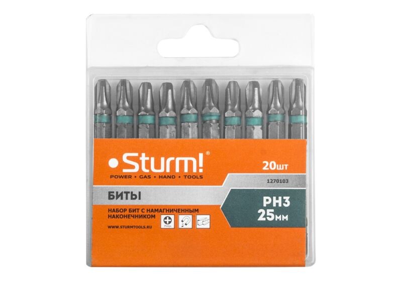 1270103 Биты PH3x25мм,сталь S2, С МАГНИТН. НАКОНЕЧНИКОМ,20 шт. в пластик.кейсе Sturm!