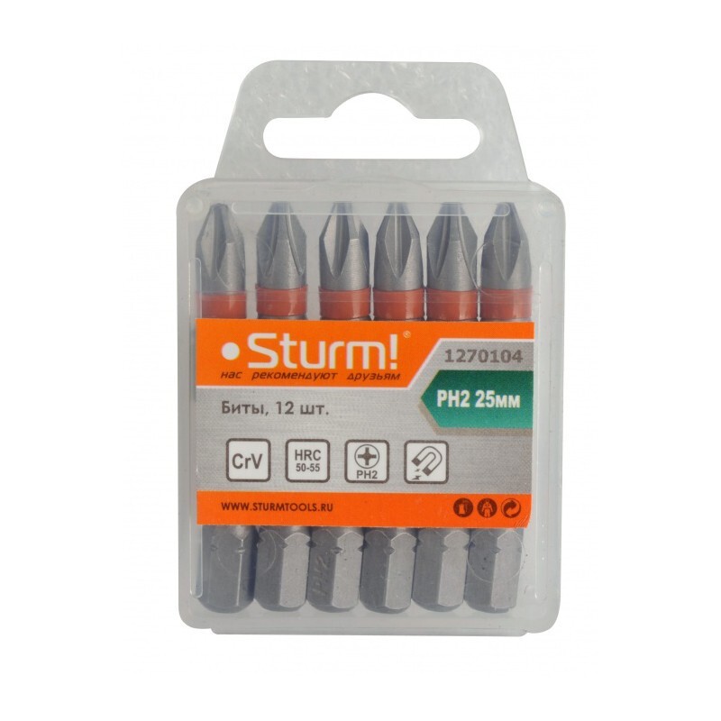 Sturm!. 1270104 Биты PH2x25мм, сталь CrV, С МАГНИТН. НАКОНЕЧНИКОМ,12 шт. в пластик.кейсе