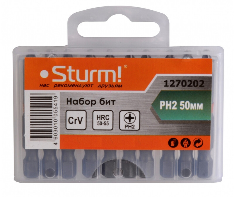 1270202 Биты PH2x50мм, сталь CrV, С МАГНИТН. НАКОНЕЧНИКОМ,10 шт. в пластик.кейсе Sturm!
