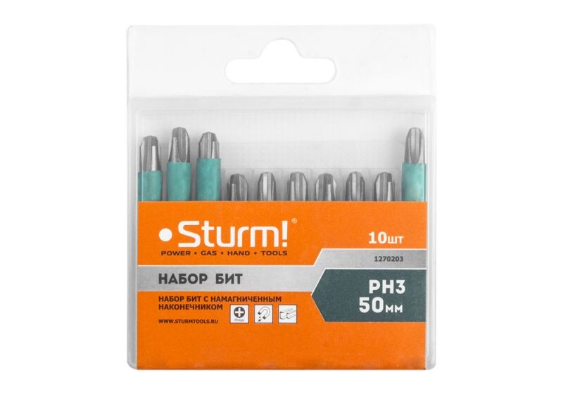 1270203 Биты PH3х50мм,сталь S2, С МАГНИТН. НАКОНЕЧНИКОМ,10 шт. в пластик.кейсе Sturm!