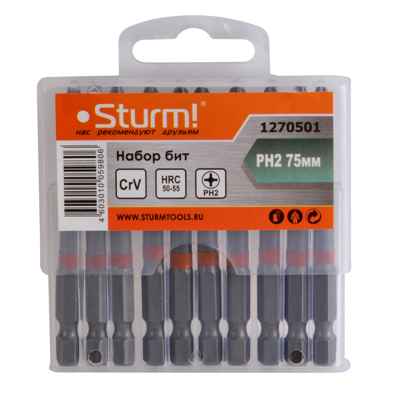 1270501 Биты PH2x75мм, сталь CrV, С МАГНИТН. НАКОНЕЧНИКОМ,10 шт. в пластик.кейсе Sturm!