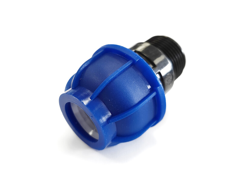 Муфта компрессионная соединительная c наружной резьбой — фитинг, предназначенный для соединения полиэтиленовой трубы и элементов с резьбовыми соединениями. Имеет наружную резьбу.