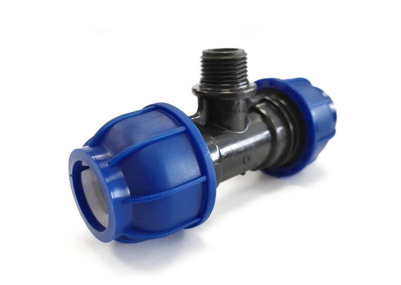 Тройник компрессионный соединительный c наружной резьбой — фитинг, предназначенный для разветвления ПНД труб и элементов с резьбовыми соединениями. Имеет наружную резьбу.