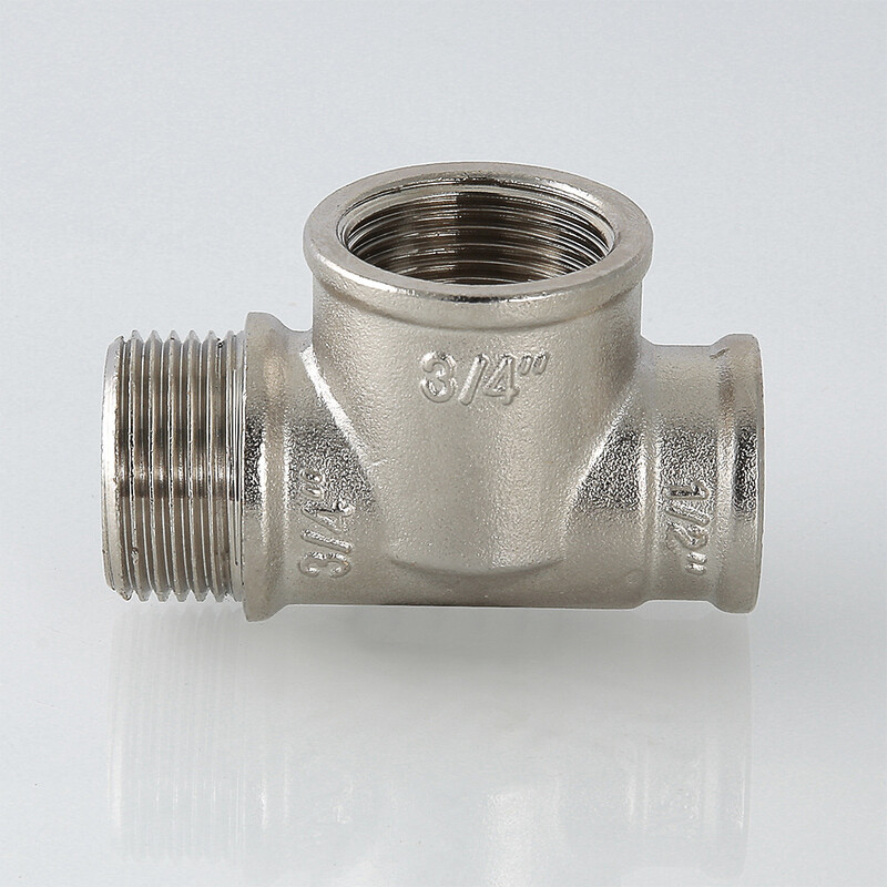 Резьбовой фитинг – тройник с переходом на наружную резьбу изготовлен из латуни марки CW617N методом горячего штампования с последующим нанесением никелевого гальванопокрытия. Применяется для создания разъемных резьбовых соединений на трубопроводах из стальных, медных, латунных, пластиковых и металлопластиковых труб. Резьба – трубная цилиндрическая по ГОСТу 6357 (ISO 228, EN 10226), наружная/внутренняя/внутренняя. Допускается соединение внутренней резьбы с наружной конической трубной по ГОСТу 6211 (ISO R7). Наружная резьба фитинга имеет насечки для эффективного удержания уплотнительного материала.