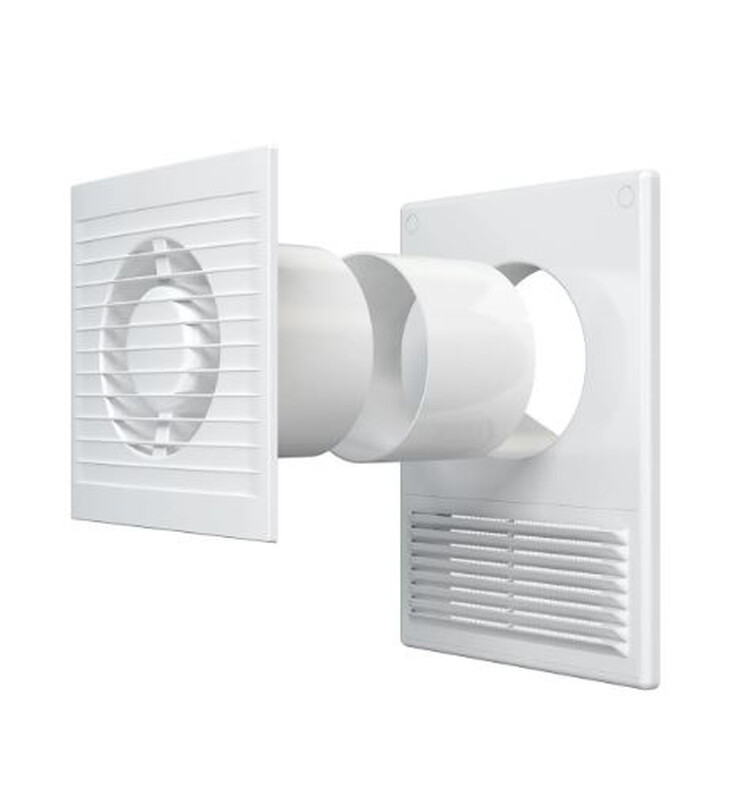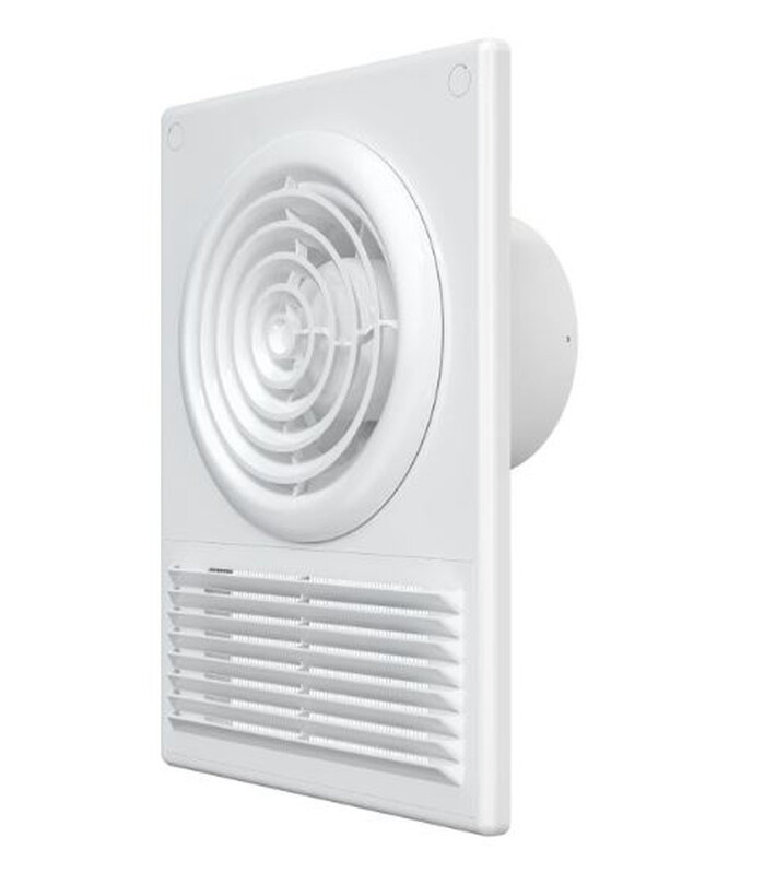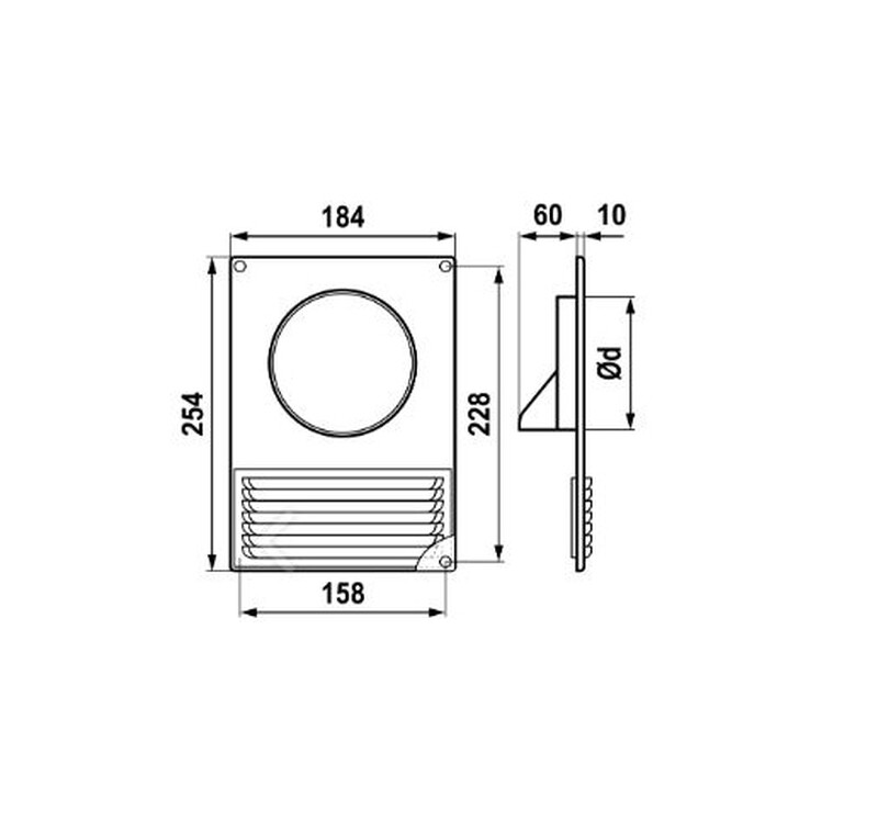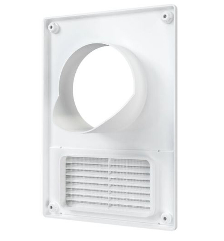 Имеет съемную решетку с наклонными жалюзи, защитную сетку от насекомых и девиатор для предотвращения обратного потока.
