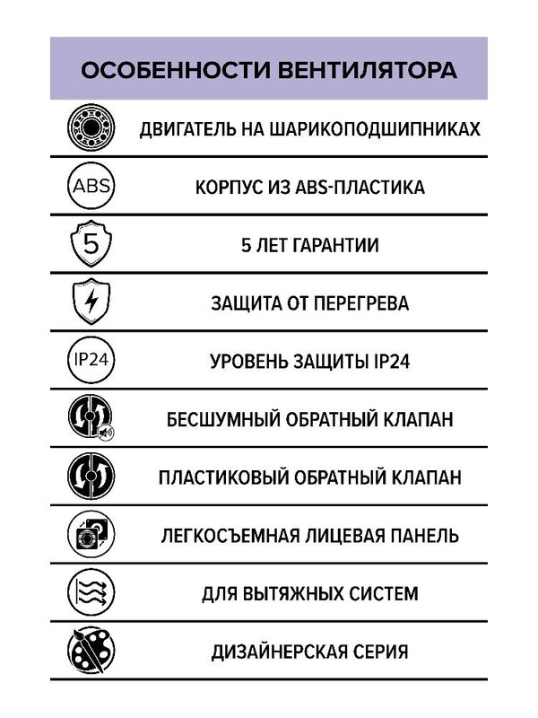 Двигатель на шарикоподшипниках; Световая индикация; Низкое энергопотребление; Низкий уровень шума; Защита от перегрева; Степень защиты изделия IP 45; Монтаж с помощью саморезов; Тонкая лицевая панель; Для вытяжных систем
