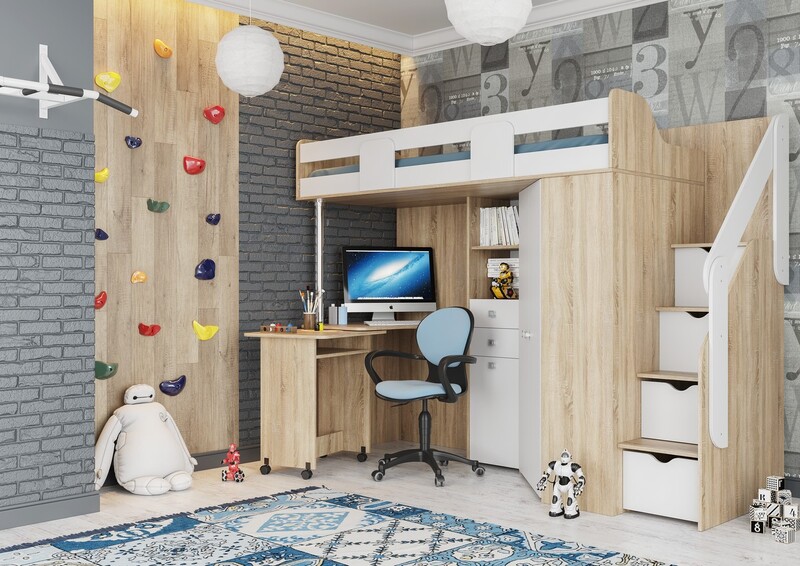 МК Стиль. МИЙА 3 (Кровать-чердак) Корпус - Дуб Сонома светлый Фасад ЛДСП - Белый (Шагрень) (7 мест) ГИ306 КАТЕГОРИЯ А