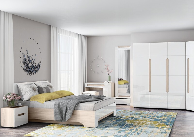 Каркас выполнен в светлых тонах с имитацией текстуры дерева и глянцевого белого фасады из МДФ. Благодаря такому оформлению кровать будет гармонично смотреться в любом интерьере. При выборе этой модели закажите и другие элементы мебели из серии «ПАЛЕРМО».