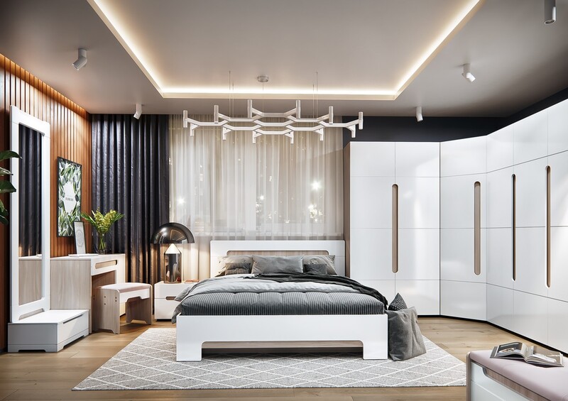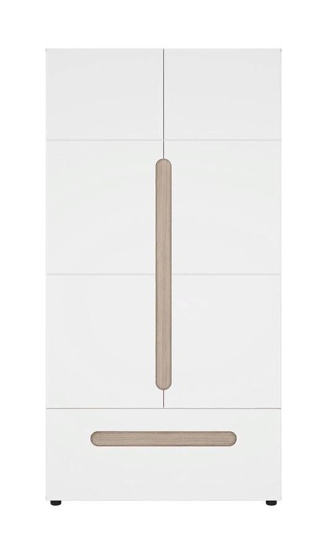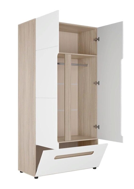 2-х створчатый шкаф с распашными дверями из модульной системы Палермо-3. Внутри в левой части находится верхняя полочка и штанга для одежды, в правой части полки для белья. Фасад имеет вырез закрытые сзади декоративной планкой в цвет корпуса.