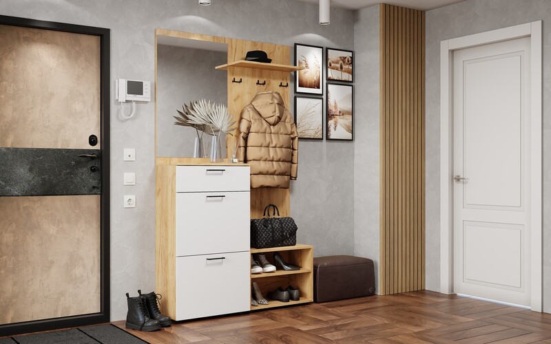 Прихожая состоит из 4-х конструкционных элементов: • Тумба с фасадами - Д.600 х В.1118 х Г.350 мм • Тумба открытая - Д.600 х В.470 х Г.350 мм • Навесной щит с зеркалом - Д.600 х В.982 х Г.20 мм • Навесной щит с крючками - Д.600 х В.1630 х Г.218 мм