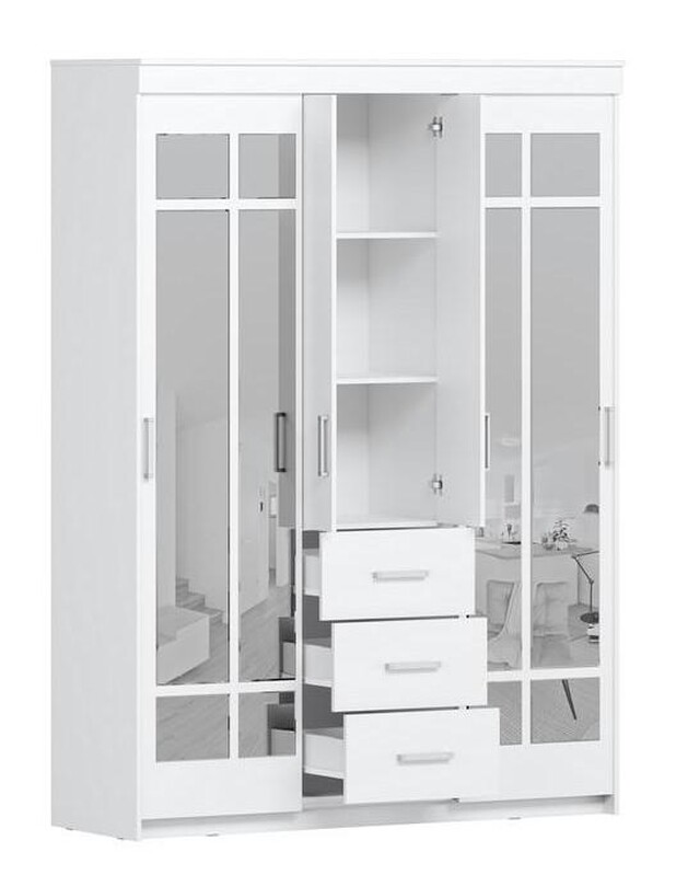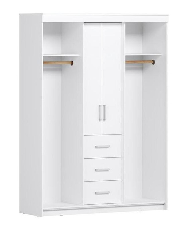 • В конструктиве шкафа предусмотрены 2 просторных секции со штангами под одежду, 3 небольших отсека с полками, а также три выдвижных ящика.
