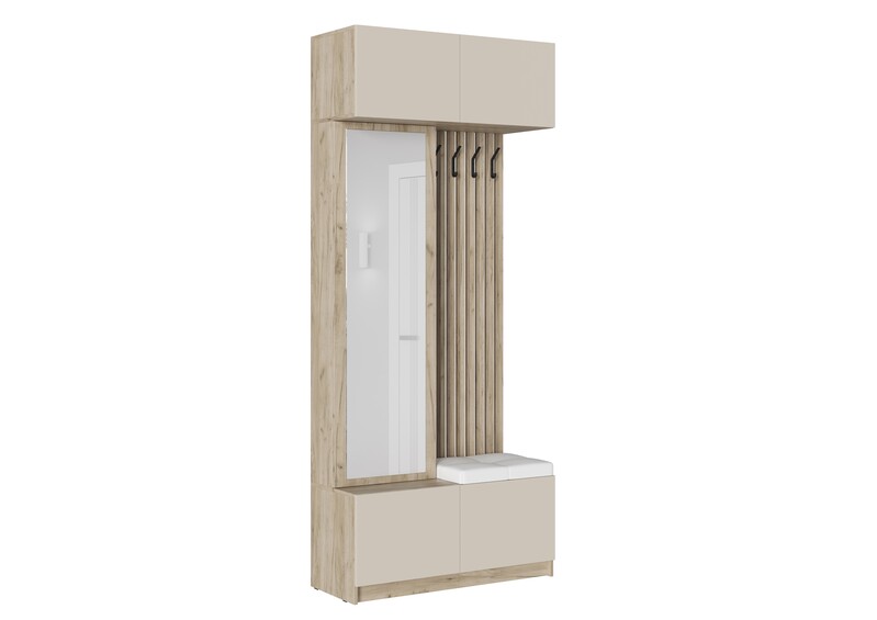 МК Стиль. БОСТОН прихожая ЛДСП (Комплект) Корпус - Дуб Крафт серый Фасад ЛДСП - Кашемир 5981 BS Кожзам.- Ecotex 3002 (Белая) АГ3 110 (3 места)