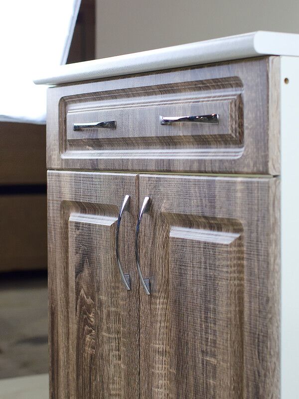 Модульная мебель из высококачественной ЛДСП с фасадом из МДФ - это практичный и экономный выбор для кухонь. В ассортименте компании представлены тумбы, рабочие столы и навесные шкафы (с полками или сушилками на выбор). Мебель различается по размеру и цвету материала. Преимущества мебели: - Кромка ПВХ; - Глубина тумб — 436мм, что позволяет устанавливать изделия не вплотную к стене, оставляя место для канализационных труб; - Цоколь позволяет избегать контакты тумбы с поверхностью пола; - Регулируемые ножки.
