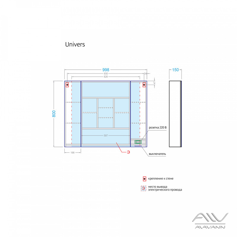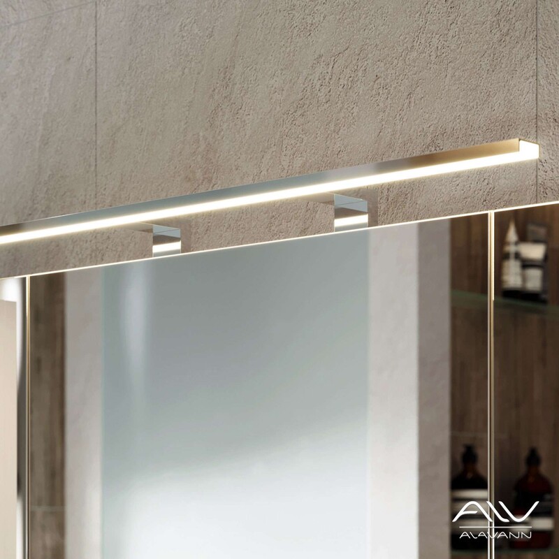 Размер шкафа позволяет разместить в трех внутренних секциях все необходимое. Дверки на петлях с доводчиками закрываются легко и бесшумно. В комплекте со шкафом зацеп для их открывания. Дополняет полезный функционал встроенная розетка с выключателем для фена или электробритвы. Дополнительно комплектуется навесным светильником (в стоимость не входит и заказывается отдельно).