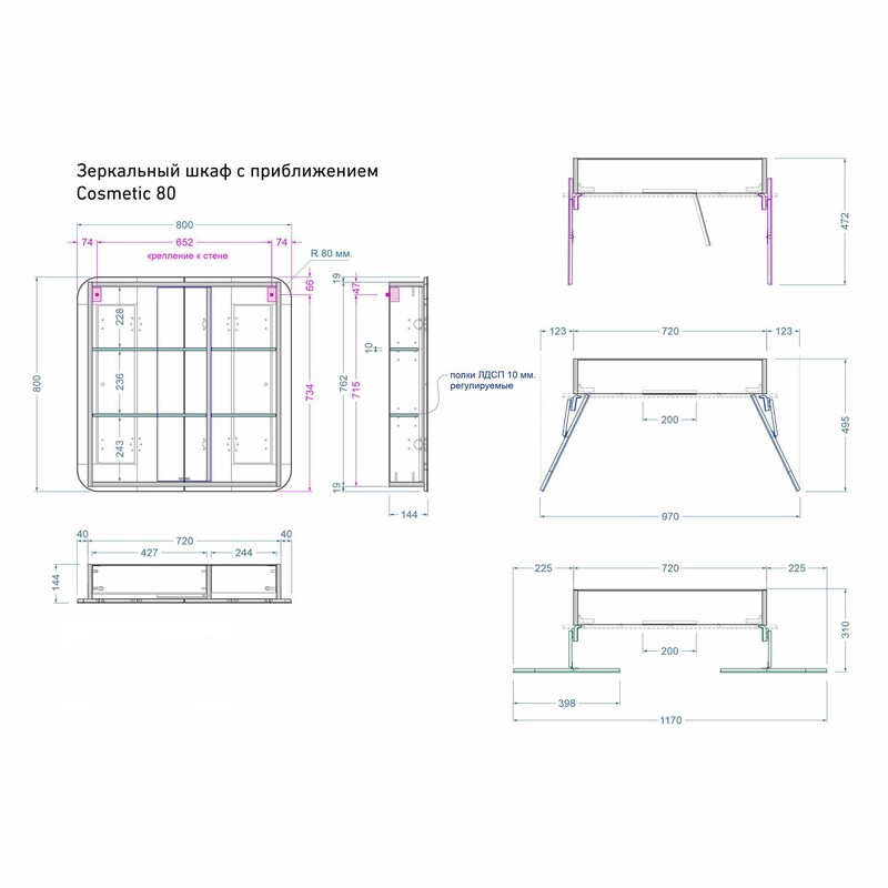 Размер навесного зеркального шкафа составляет 80х16х80 см. Материал изготовления – влагостойкая ЛДСП, которая не портится от длительного нахождения во влажной среде. Холодный свет декоративной LED ленты наполняет комнату атмосферой чистоты и свежести. Петли с доводчиками обеспечивают плавное закрытие створок и защищают их от случайного удара о корпус.