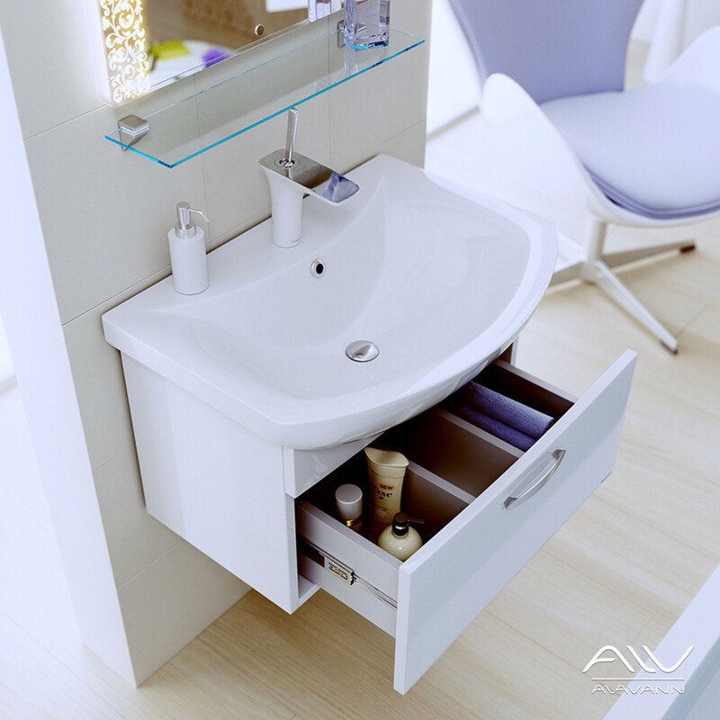 Белая подвесная тумба для ванной 60 Alta – оптимальное сочетание функциональности и стиля, которое поможет воплотить в реальность дизайн ванной комнаты Вашей мечты. Произведена из качественных материалов и окрашена глянцевой эмалью, которая придает изделию красивый блеск и дополнительную влагостойкость. В тумбе есть удобный внутренний ящик для хранения бытовых принадлежностей. Модель компактна, надежно крепится к стене и не занимает место на полу, не создавая при этом сложностей в уборке помещения. Идеальный вариант мебели для пола с подогревом. Тумба под раковину Alta 60 корпус – ДСП, фасад – МДФ; покрытие – глянцевая эмаль; ящик на шариковых направляющих; внутренняя конструкция ящика позволяет проводить трубы и другие сантехнические коммуникации; дополнена стильной хромированной ручкой. Производитель оставляет за собой право без предварительного уведомления покупателя вносить изменения в конструктив или технологию изготовления изделия, которые не влияют на функционал изделия.
