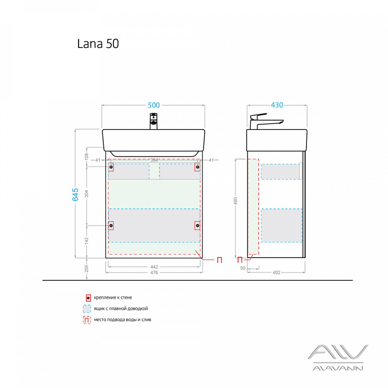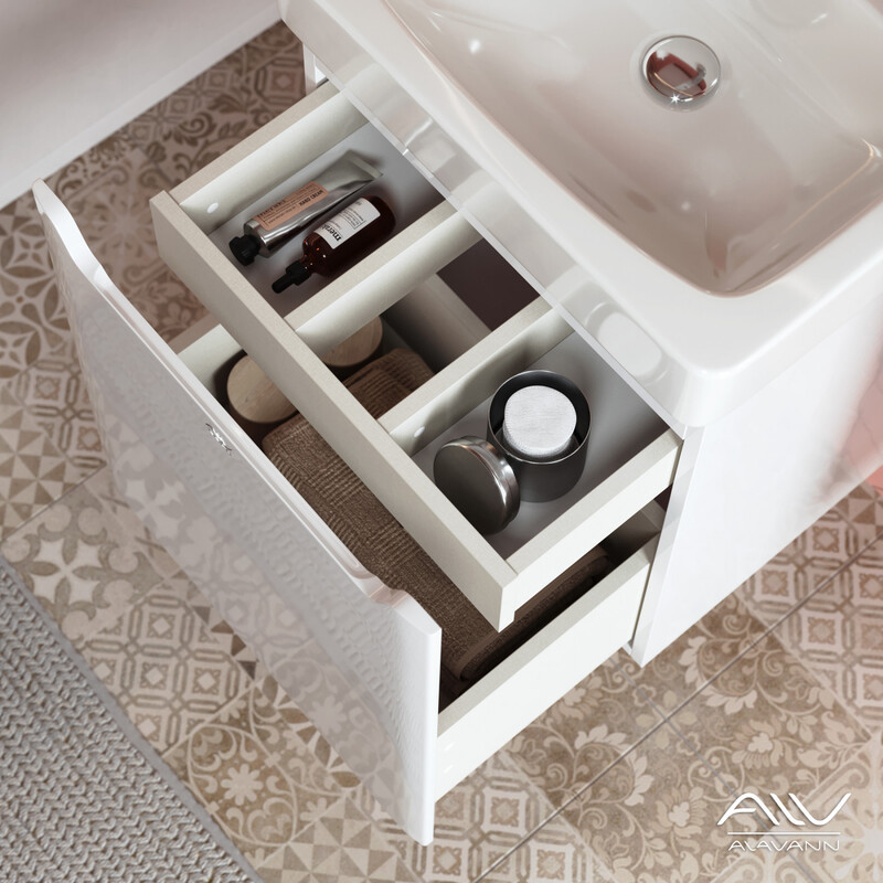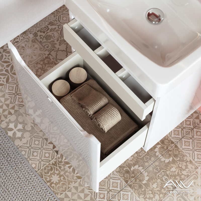 Современная подвесная тумба для ванной Лана (размер 50 см) белого цвета с гладким фасадом и двумя выдвижными ящиками. Корпус тумбы изготовлен из ДСП, фасад из МДФ, боковые стенки и передние планки выполнены из глянцевой белой ДСП. Нижний ящик с высоким фасадом, также как и верхний внутри отделан фирменным материалом «интерьерный лен». Компактная ширина изделия позволяет разместить тумбу для раковины в небольших помещениях. Верхний ящик скрыт за общим фасадом на направляющих с механизмом push-to-open. Нижний ящик на направляющих «Hettich» с доводчиками, позволяет комфортно доставать хранящиеся там предметы. Вместо привычных ручек предусмотрена ручка-зацеп, интегрированная в фасад. Тумба представляет собой образец современного дизайна, технологических достижений, функциональности и практичности. К стене мебель крепится при помощи четырех L-образных навесов. Производитель оставляет за собой право без предварительного уведомления покупателя вносить изменения в конструктив или технологию изготовления изделия,