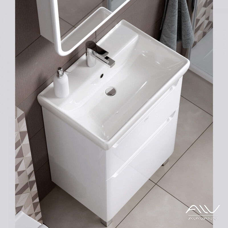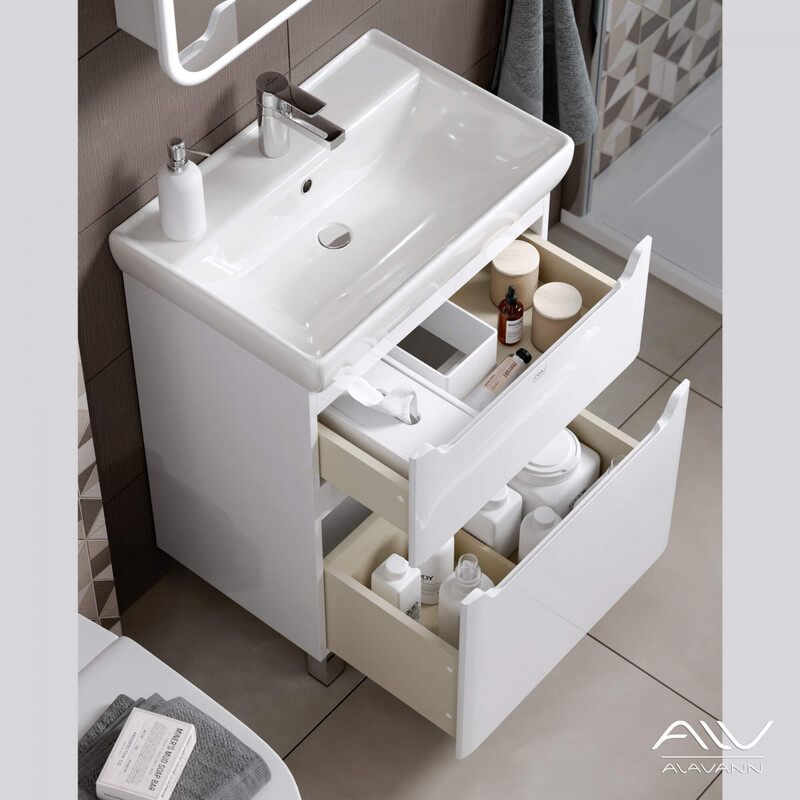 Современная напольная тумба в ванную Лана 70 имеет гладкий фасад и два выдвижных ящика с декоративными зацепами для хранения нужных мелочей. Ящики изготовлены из ДСП с применением фирменного материала Твист. Для удобства они оснащены доводчиками плавного закрывания. Производитель тумбы под раковину Lana (размер 70 см) гарантирует длительную ее эксплуатацию в условиях повышенной влажности, так как корпус из ДСП и фасады из МДФ были обработаны влагостойкой белой глянцевой эмалью. Это практичное и функциональное изделие (ширина 70 см), представляющее собой прекрасный образец современного дизайна, способно вписаться в любой интерьер помещения. Производитель оставляет за собой право без предварительного уведомления покупателя вносить изменения в конструктив или технологию изготовления изделия, которые не влияют на функционал изделия.