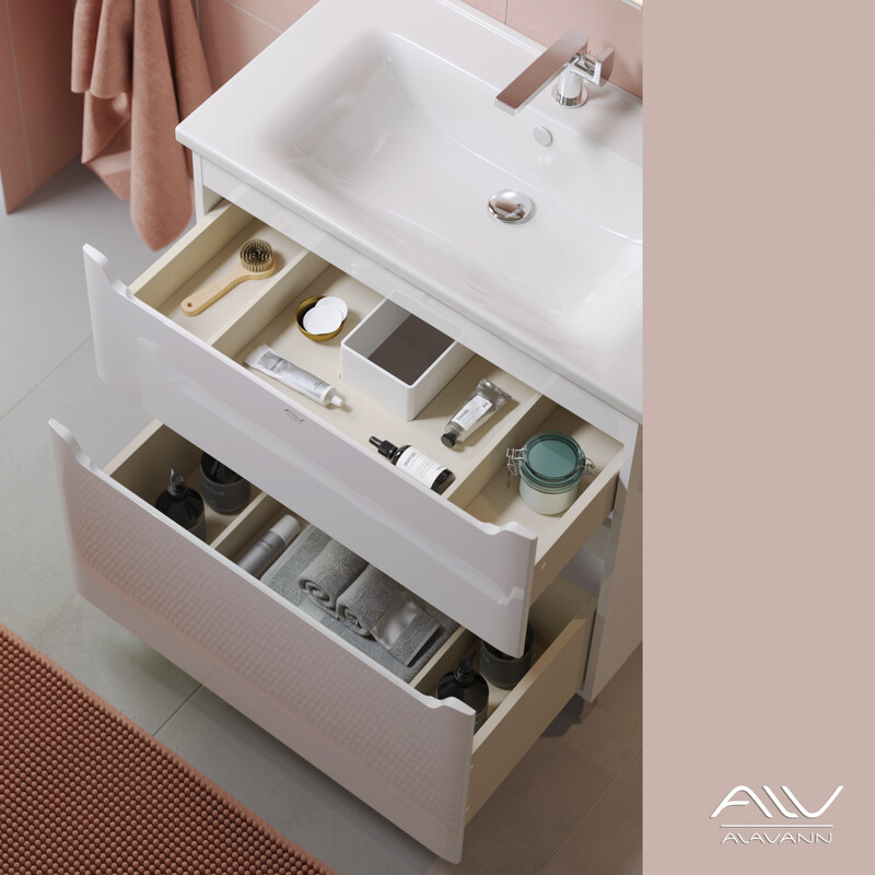 Тумба под раковину Lana 80 см для ванной белого цвета с гладким глянцевым фасадом и двумя выдвижными ящиками. Вместо наружных ручек дизайнеры использовали современные удобные зацепы. Ящики тумбочки с умывальником благодаря своему размеру практичны и функциональны. Внутри они отделаны фирменным материалом "интерьерный лен". Ящики на направляющих Hettich c доводчиками, с разделителями для гармоничного размещения необходимых принадлежностей. Корпус изделия сделан из ДСП, фасад – из МДФ. Фасад тумбы Лана покрыт белой глянцевой эмалью, что обеспечивает длительную эксплуатацию в условиях повышенной влажности. В комплект тумбы в ванную входит керамическая мойка. Производитель оставляет за собой право без предварительного уведомления покупателя вносить изменения в конструктив или технологию изготовления изделия, которые не влияют на функционал изделия.