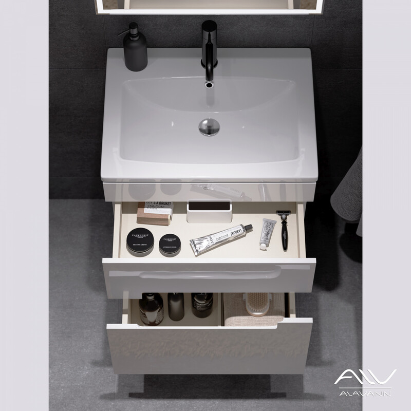 Современная подвесная тумба с раковиной для ванной Рита 60 благодаря своим компактным размерам прекрасно впишется в любое помещение, и станет настоящим украшением дизайнерской обстановки. Корпус изделия (размер 60) изготовлен из ЛДСП, фасады – из МДФ. Сверху мебель покрыта глянцевой эмалью.