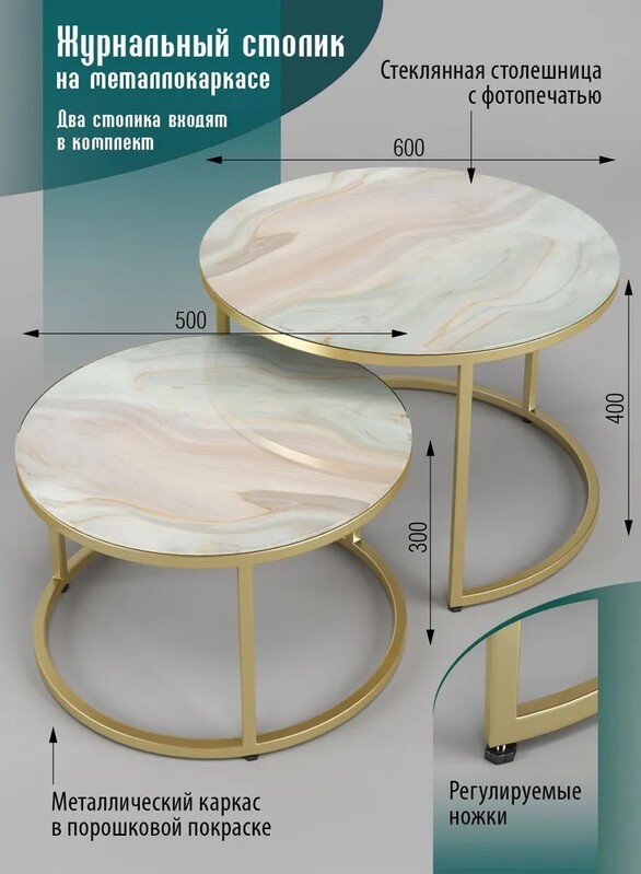 Журнальные столики «Дуэт» СТЕКЛО (комплект 2 шт.) Нежность/золото, стекло 600*600*400 и 500*500*300, рама металл