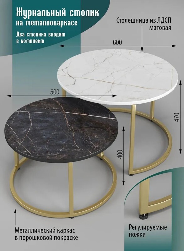 Журнальные столики SANTREK HOME «Дуэт» (комплект 2 шт.) БелЧерМрамор/Золото ЛДСП 600*600*470 и 500*500*400, рама металл