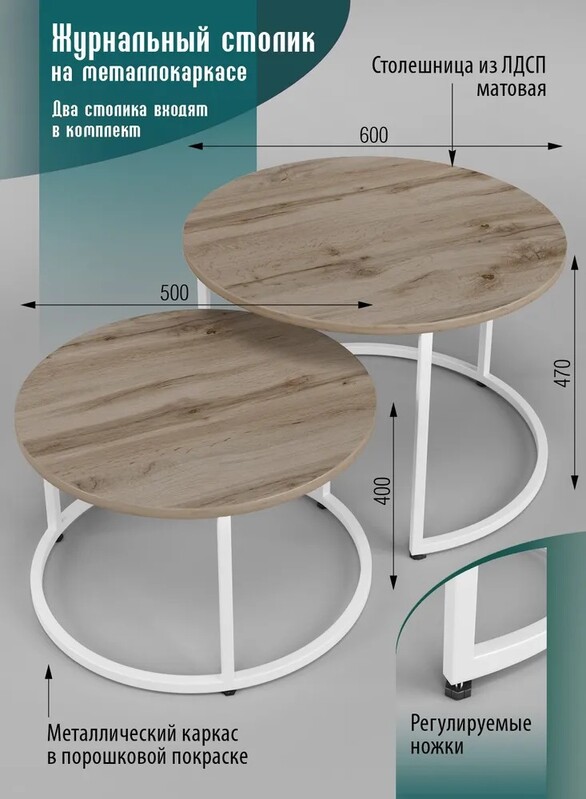 Журнальные столики SANTREK HOME «Дуэт» (комплект 2 шт.) Дуб Ватан/Белый ЛДСП 600*600*470 и 500*500*400, рама металл