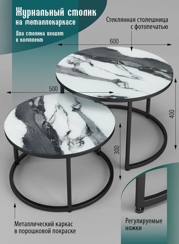 Журнальные столики SANTREK HOME «Дуэт» СТЕКЛО (комплект 2 шт.) Белый Черный/Черный, стекло 600*600*400 и 500*500*300, рама металл