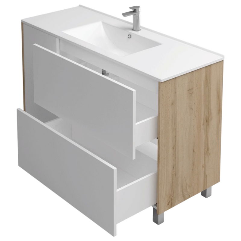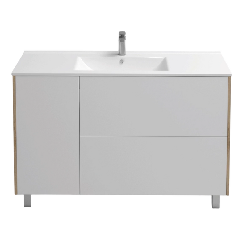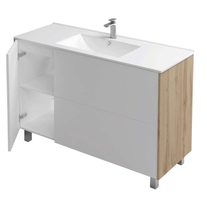 Модель оснащена одной распашной дверцей и двумя выдвижными ящиками, рассчитана на установку раковины Holler E-120.