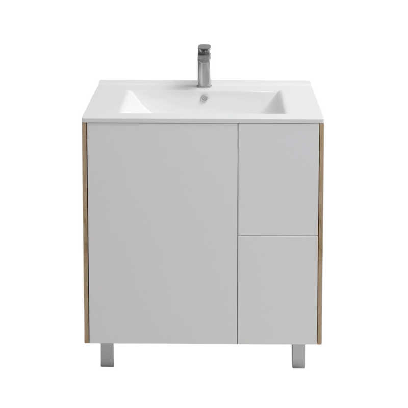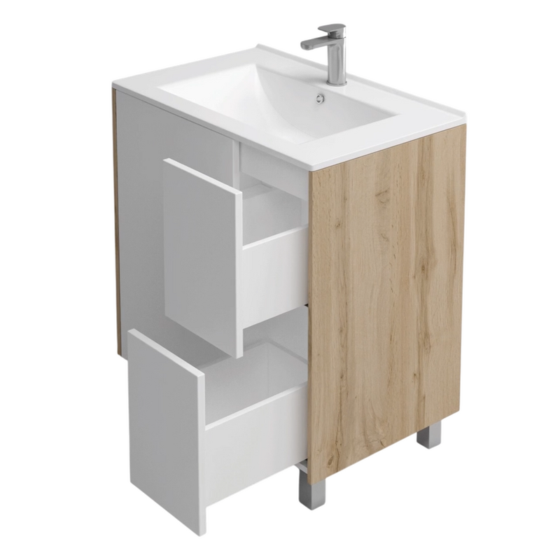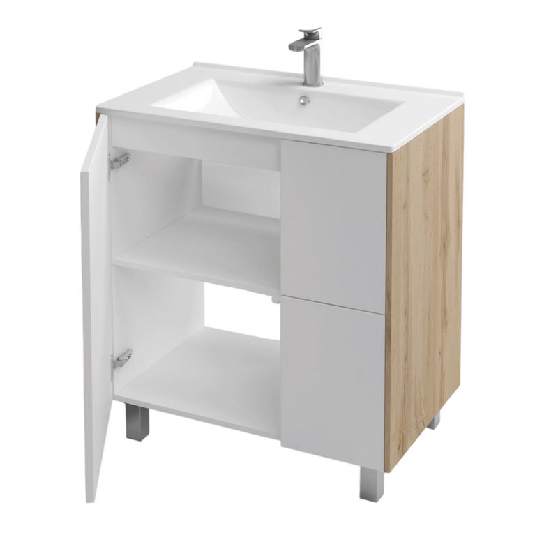Модель оснащена одной распашной дверцей и двумя выдвижными ящиками, рассчитана на установку раковины Holler E-70.