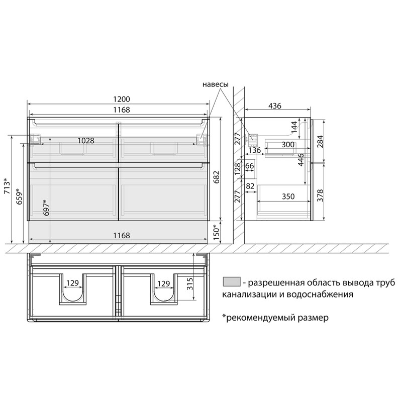 • Габариты без раковины (ШГВ): 1200х445х682 мм;