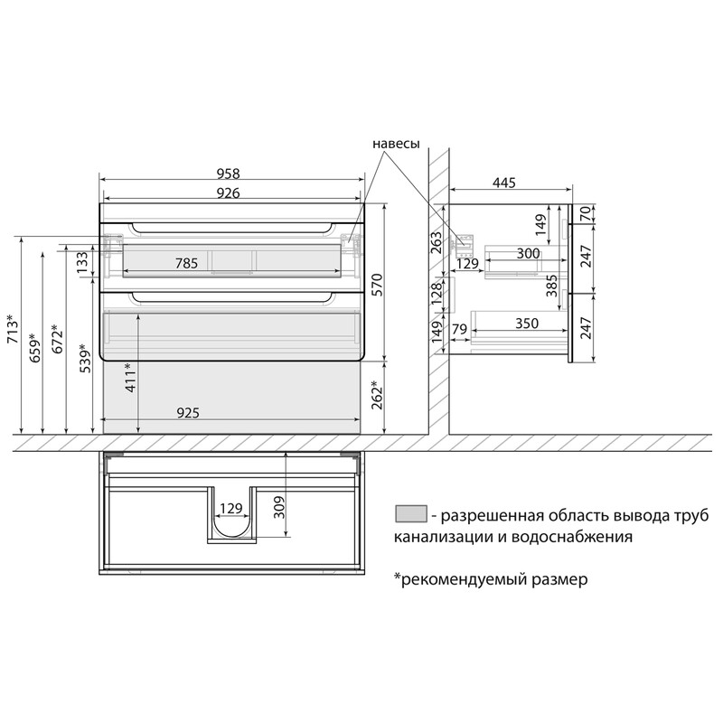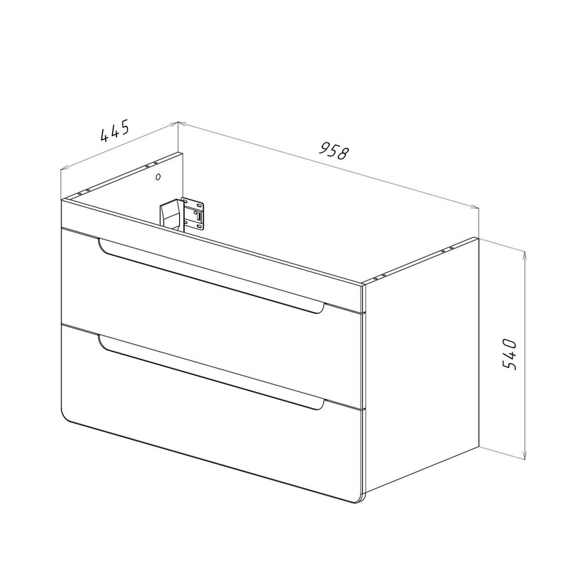 • Габариты без раковины (ШГВ): 958х445х540 мм;