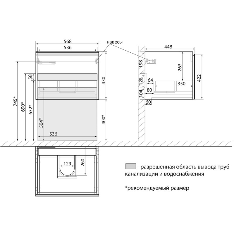 • Габариты без раковины (ШГВ): 568х448х430 мм;