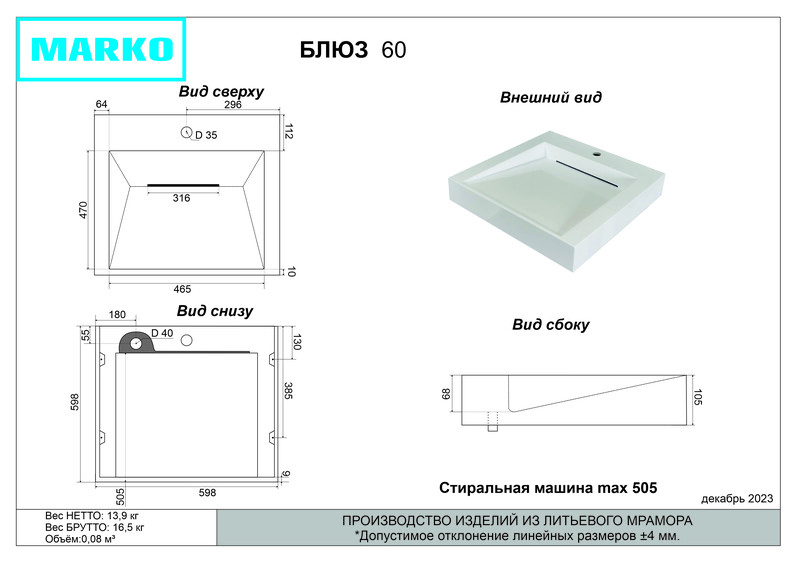 Умывальник "Блюз 60" литьевой мрамор, 598х598х105 над стиральной машиной, в комплекте кроншт., крепл. и выпуск с пер. г. Ульяновск