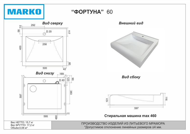 Умывальник "Фортуна 60" литьевой мрамор, 595х597х116 над стиральной машиной, в комплекте кроншт., крепл. и выпуск с пер. г. Ульяновск