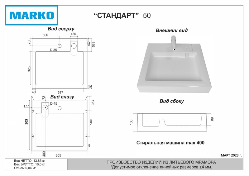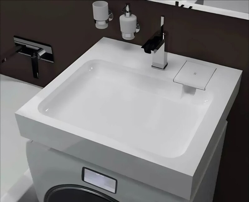 Умывальник "Стандарт 50" литьевой мрамор, 605х505х100 над стиральной машиной, в комплекте кроншт., крепл. и декорат. накладка г. Ульяновск