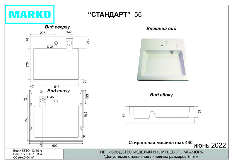 Умывальник "Стандарт 55" литьевой мрамор, 602х553х98 над стиральной машиной, в комплекте кроншт., крепл. и декорат. накладка г. Ульяновск