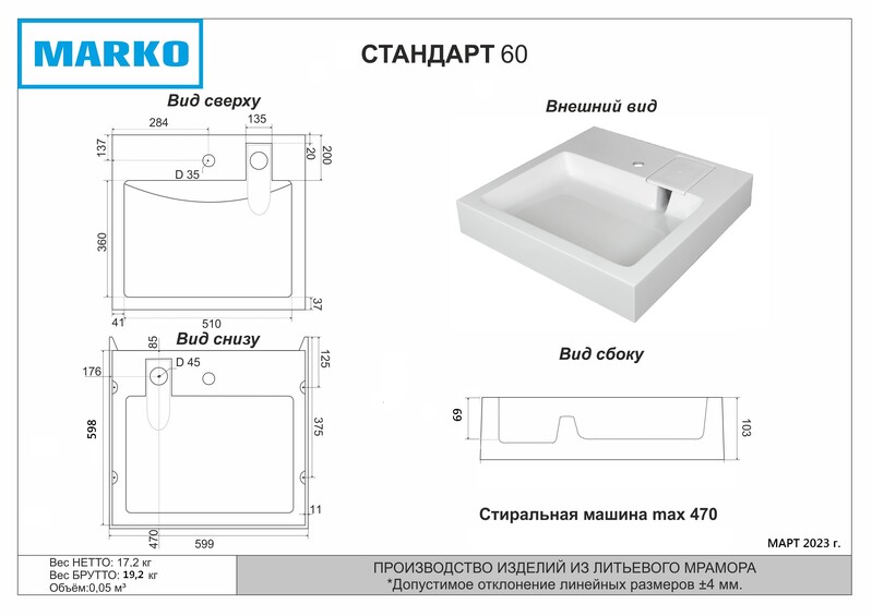 Умывальник "Стандарт 60" литьевой мрамор, 599х598х108 над стиральной машиной, в комплекте кроншт., крепл. и декорат.накладка г.Ульяновск