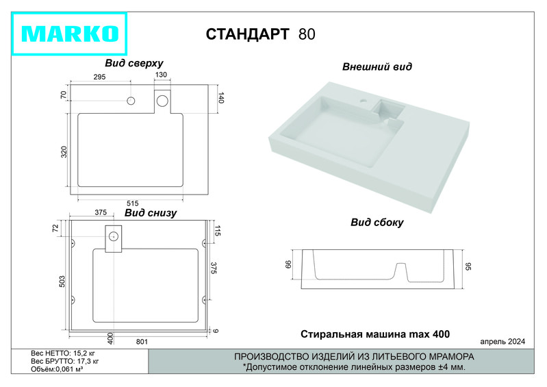 Умывальник "Стандарт 80" литьевой мрамор, 801х503х95 над стиральной машиной, в комплекте кроншт., крепл. и декорат.накладка г. Ульяновск