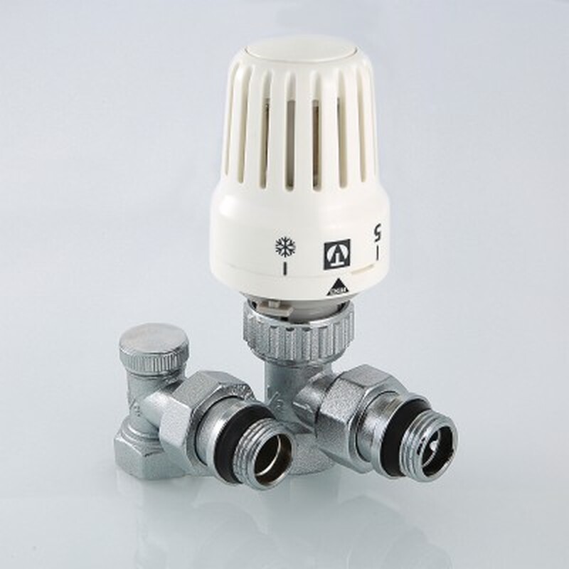 Комплект терморегулирующего оборудования VT.045 включает в себя угловые термостатический и запорно-регулировочный (настроечный) радиаторные клапаны и термостатическую головку. Набор предназначен для бокового подключения прибора водяного отопления, автоматического регулирования расхода теплоносителя через него в зависимости от температуры воздуха в помещении, гидравлической балансировки системы отопления.