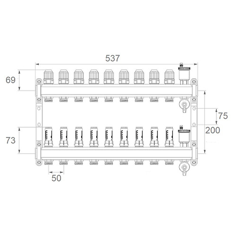 Коллекторная группа ONDO нерж сталь 9 вых. в сборе с автоматическим воздухоотводчиком, расходомерами и термостатическими клапанами OKGSET09A