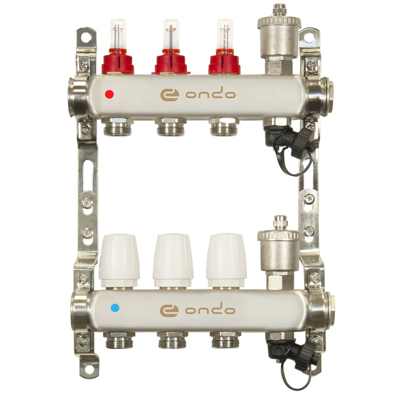 СТМ. Коллекторная группа ONDO нерж сталь 3 вых. в сборе с автоматическим воздухоотводчиком, расходомерами и термостатическими клапанами OKGSET03A