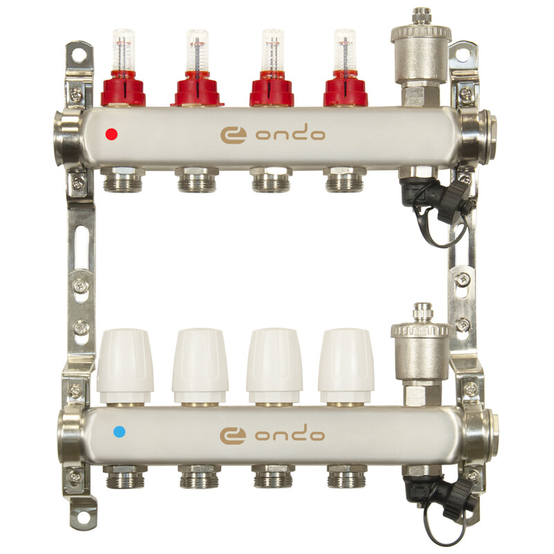 СТМ. Коллекторная группа ONDO нерж сталь 4 вых. в сборе с автоматическим воздухоотводчиком, расходомерами и термостатическими клапанами OKGSET04A